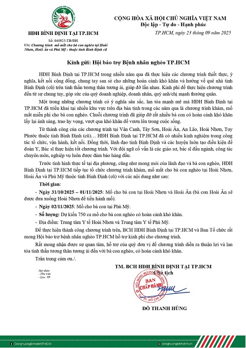 Hôm nay, ngày 9/9/2025, Hội Bảo trợ Bệnh nhân nghèo TP.HCM (Hội) phối hợp cùng...